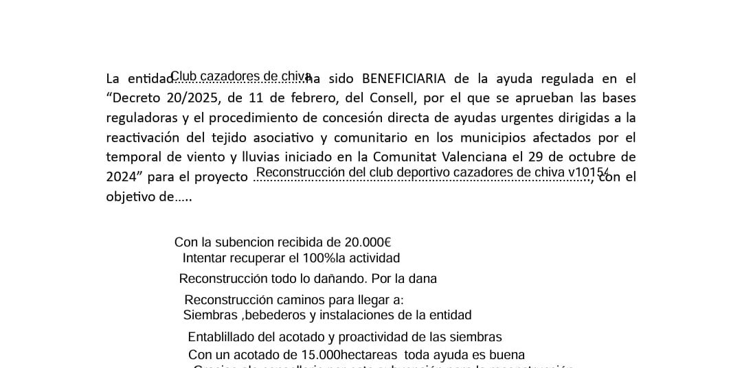 El Club de Cazadores de Chiva recibe una subvención para reparar los daños causados por la DANA