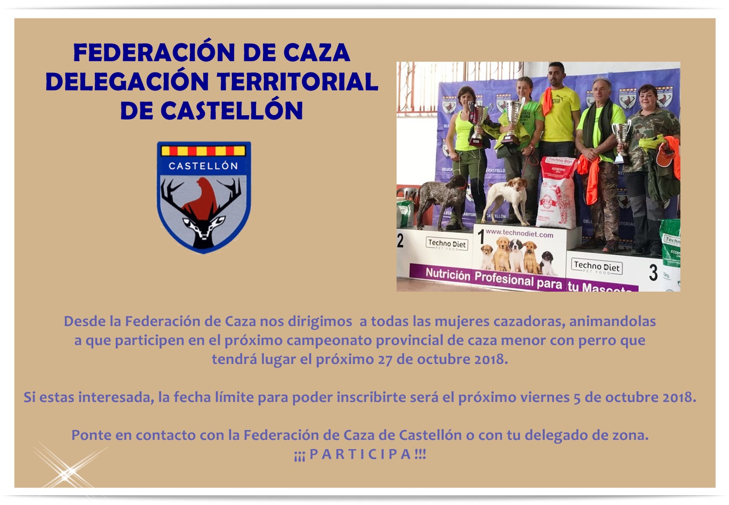 COMUNICADO INSCRIPCIÓN DE DAMAS PARA EL CAMPEONATO PROVINCIAL DE CAZA MENOR CON PERRO Escrito el 27 septiembre, 2018 por COMUNICACIONCASTELLON
