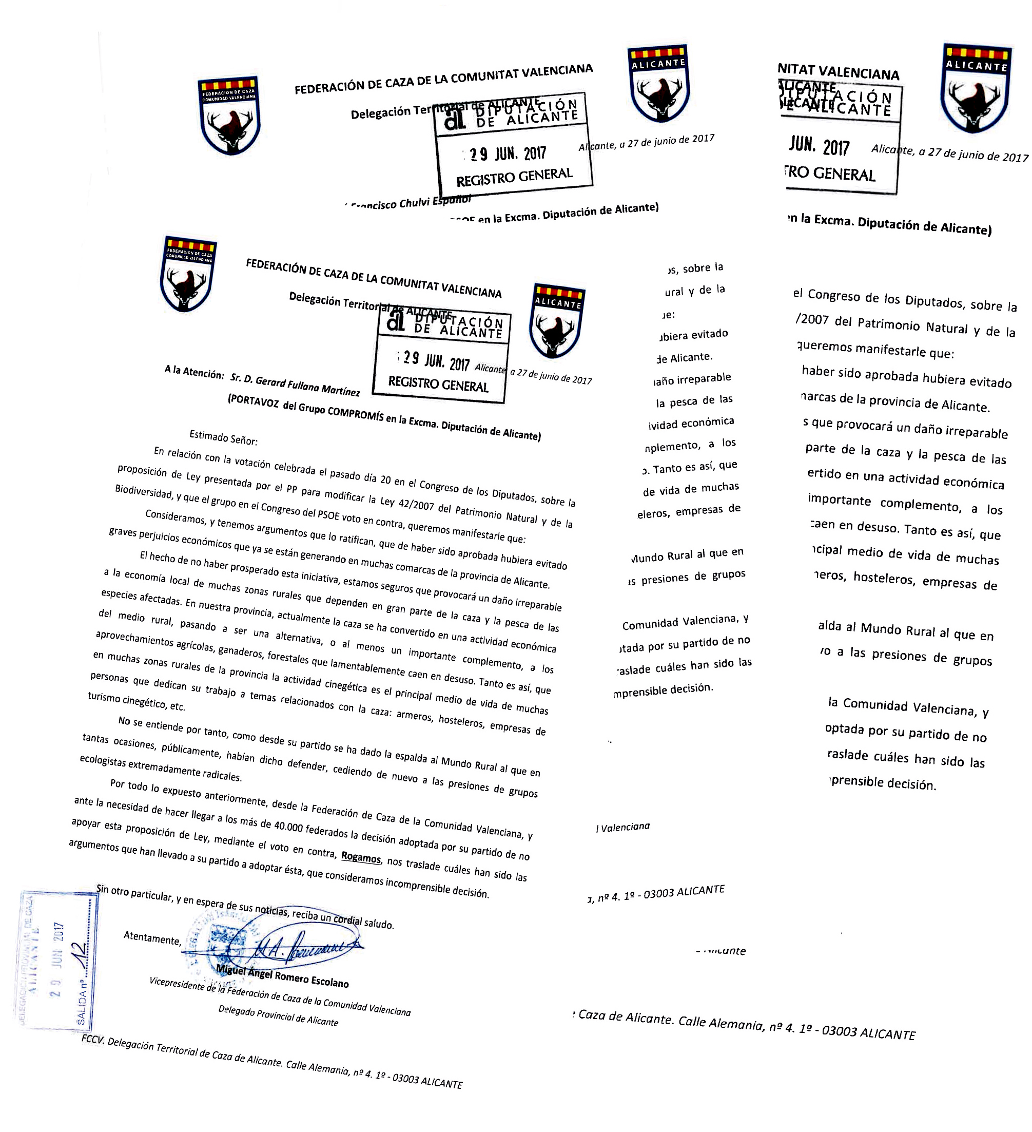 Esta semana, y tras la incorporación de los diputados provinciales de Alicante a su tareas después de las fiestas de San Juan, el delegado territorial de la provincia, Migue Ángel Romero, ha presentado sendos escritos en el Palacio Provincial dirigidos a los grupos que no apoyaron la propuesta.
