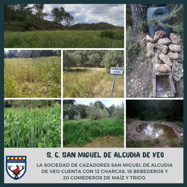 Otro coto que ha realizado diferentes mejoras ha sido la sociedad de cazadores San Miguel de Alcudia de Veo, dando especial importancia al mantenimiento y cuidado de sus 12 charcas y 16 bebederos, de cara a los meses más calurosos de año, para que los animales de la zona tengan en todo momento un punto de agua en el que hidratarse. Por otro lado, este coto cuenta con 20 comederos de maíz y trigo, que complementan a las distintas siembras que hay distribuidas por el acotado.
