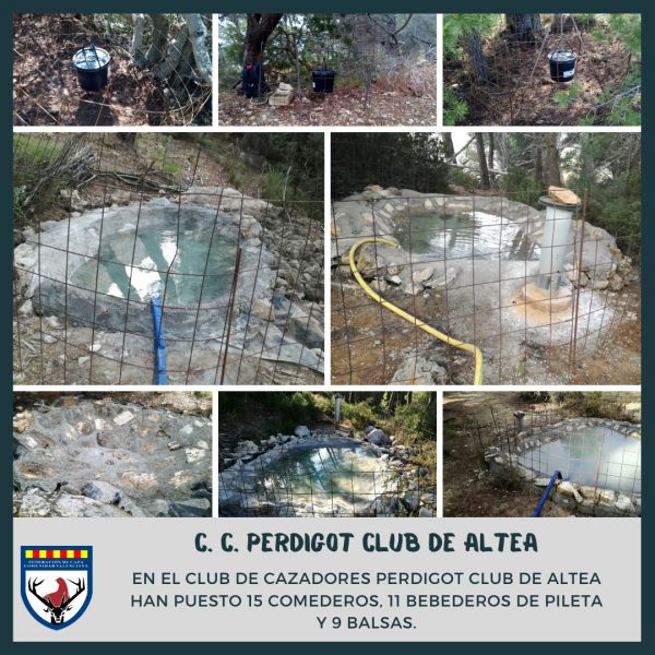 Uno de ellos es el Club de Cazadores Perdigot de Altea, que ya cuenta en su acotado con 9 balsas destinadas a mantenerlas siempre llenas de agua para que pueda beber la fauna. Además, tienen instalados 11 bebederos de pileta y han colocado 15 comederos, en los que no falta nunca el grano. Una muestra más de que estos cazadores, como tantos otros, se preocupan de que los animales de sus terrenos y los de alrededor tengan a su disposición comida y agua para beber y refrescarse, más en época estival.