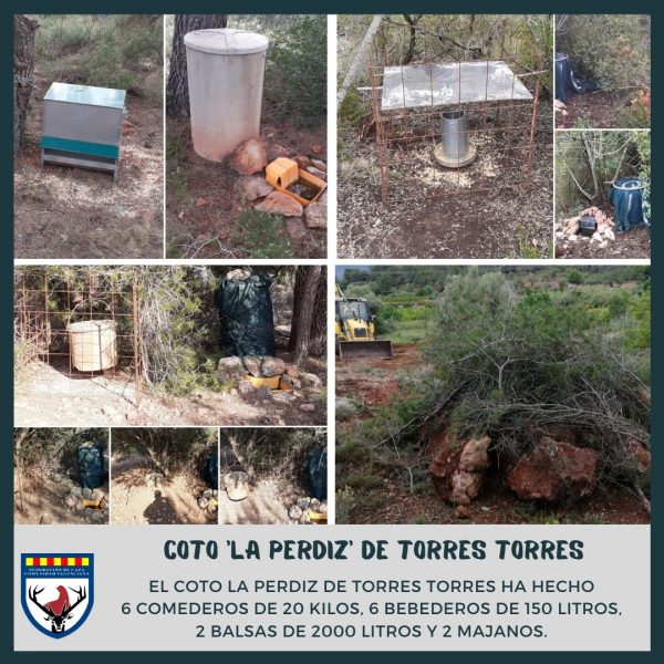 También, el Coto la Perdiz de Torres Torres ha colocado 6 nuevos comederos con capacidad de 20 kilos de grano para proporcionar alimento a la fauna. Asimismo ha repartido un total de 6 bebederos de 150 litros y ha construido 2 balsas de 2000 litros para que no falte agua en estos meses de más calor. Y también el acotado cuenta con 2 majanos que contribuyen a la proliferación del conejo.