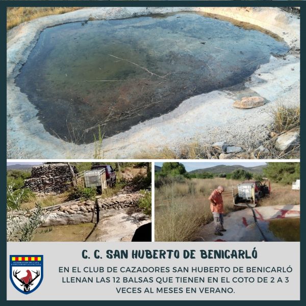 Así, el Club de Cazadores San Huberto de Benicarló, continúa con los trabajos de mantenimiento de las balsas. La junta directiva y socios del club han rellenado las balsas del acotado, en estos días de altas temperaturas y en los que el agua se evapora rápidamente. «Nosotros tenemos que llenar las 12 balsas que tenemos en el coto, al menos, 2 ó 3 veces durante verano, por el calor tan intenso que hace en la zona», afirma el presidente del club, Antonio Peinado.